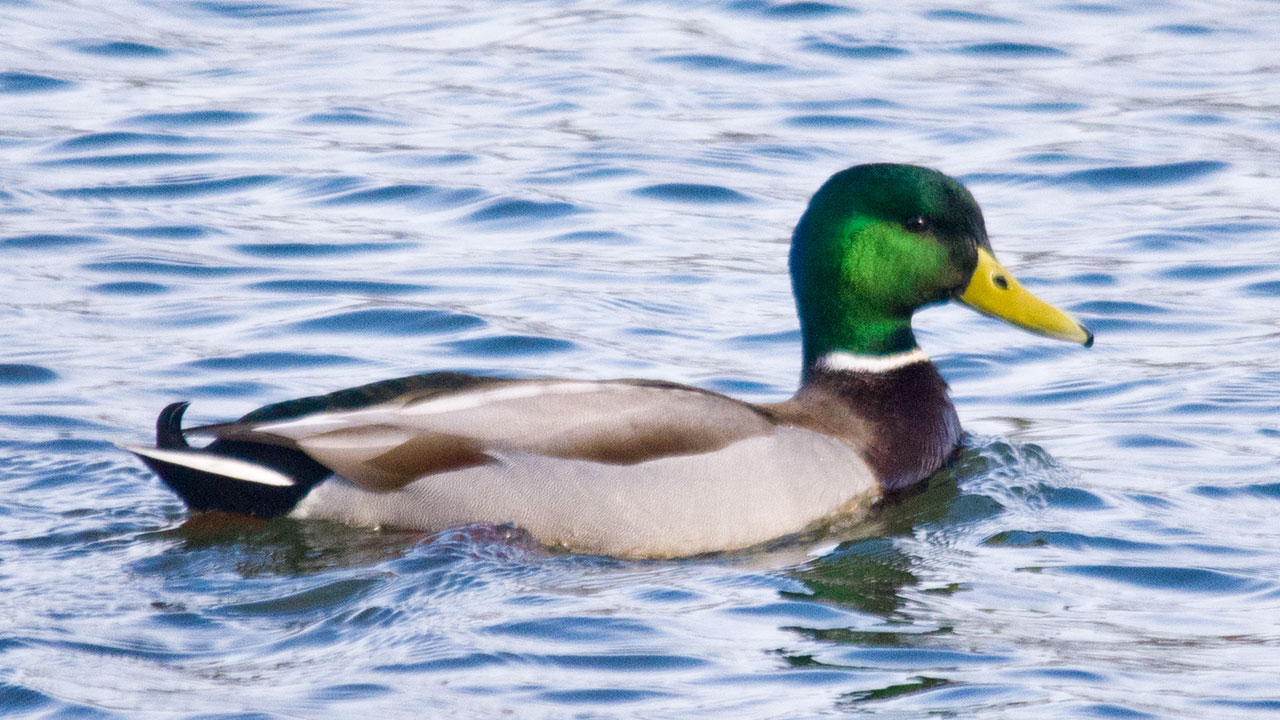 It seemed unfair to be ignoring the Mallards, particularly since I had been comparing the sizes of all the other birds with their size. One hove into view so I snapped a picture. I was hoping to get it an a grebe into the same shot but the grebe wouldn't cooperate. However, I also noticed some other ducks further out near the seagulls. After reviewing the picture when I returned home, I conclude that this is a picture of four young Hooded Mergansers. and now (Jan 22, 2013) with the benefit of reading the BNA site, I can see that these are four adult Hooded Mergansers in basic plumage. The two nearer the camera are males -- note the all-black bills and the (hard to see) yellow irises -- while the females have bills of orange and black.